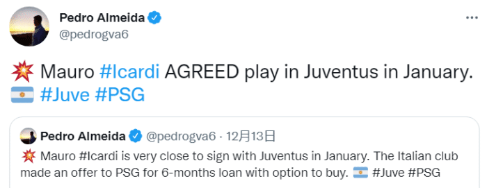 这位记者在12月13日曾经报道,伊卡尔迪接近在冬窗以租转买的方式加盟尤文。今日他跟踪了他的报道,伊卡尔迪已经同意在1月加盟尤文。