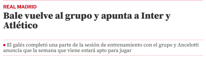 直播车讯 据西班牙媒体《世界体育报》报道,贝尔可能在下周对阵国米或马竞时复出。