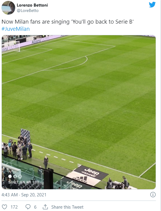 来源:直播车09-20 11:31直播车9月20日讯 据FootballItalia记者洛伦佐-贝托尼报道,在尤文vs米兰的比赛后,米兰球迷唱歌嘲讽对手,称尤文就要降级了。