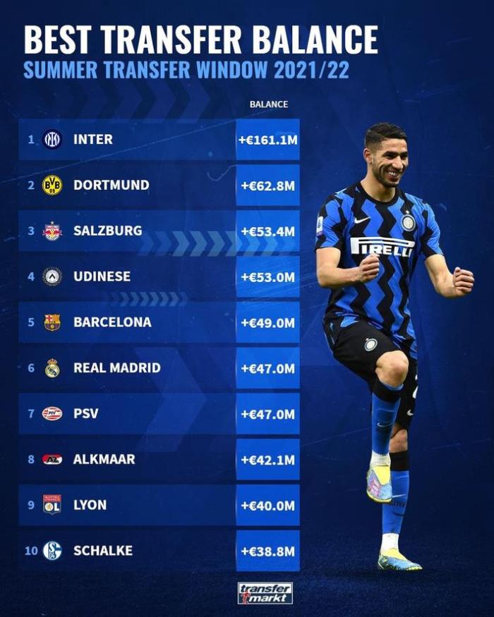 直播车9月09日讯 今年夏窗,哪家俱乐部赚得最多?今日,德国转会市场盘点今年夏季转会窗欧洲各大俱乐部净收入情况,国际米兰以1.611亿欧元遥遥领先。