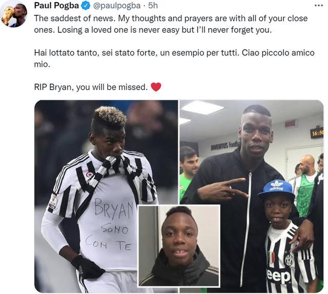 博格巴随后在推特上发文悼念了这位年轻球员,他写到:“这是最令人伤心的消息,我与你的家人同在,失去一个爱人总是艰难,但我永远不会忘记你。”