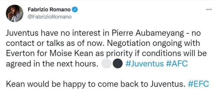罗马诺表示,尤文对于奥巴梅扬没有兴趣,没有任何谈判或接触。如果条件能够在未来几小时内达成一致,他们首选从埃弗顿签回小基恩。