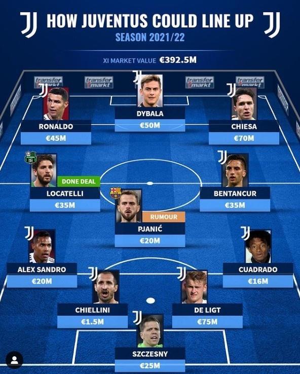 后卫:桑德罗(2000万)、基耶利尼(150万)、德里赫特(7500万)、夸德拉多(1600万)