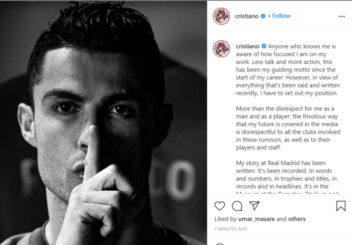 直播车8月18日讯 最近媒体盛传C罗想要离开尤文图斯,并且有消息称他把自己推荐到了曼城,另外也有报道表示C罗想要回皇马。对此,C罗表示:“认识我的人都知道我很专注于自己的工作,少说多做是我一直信奉的格言,但由于最近出现很多关于我的新闻,我必须阐明自己的立场。”