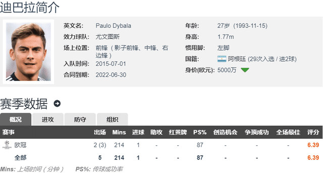 现年27岁的迪巴拉,上赛季各项赛事一共为尤文出战了26场比赛,打入了5个进球,有3次助攻。迪巴拉与尤文的合同在2022年6月30日到期,目前球员在德转的身价为5000万欧元。