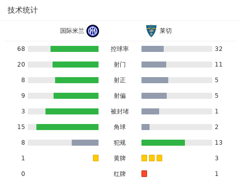 第42分钟,国米前场左侧任意球开入进去,比塞克一记回头望月攻破球门,国际米兰1-0莱切。