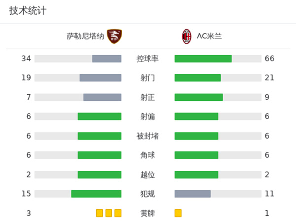 第17分钟,米兰前场左侧任意球机会,后点莱奥得球横传门前,中路托莫里跟进破门,AC米兰1-0萨勒尼塔纳。