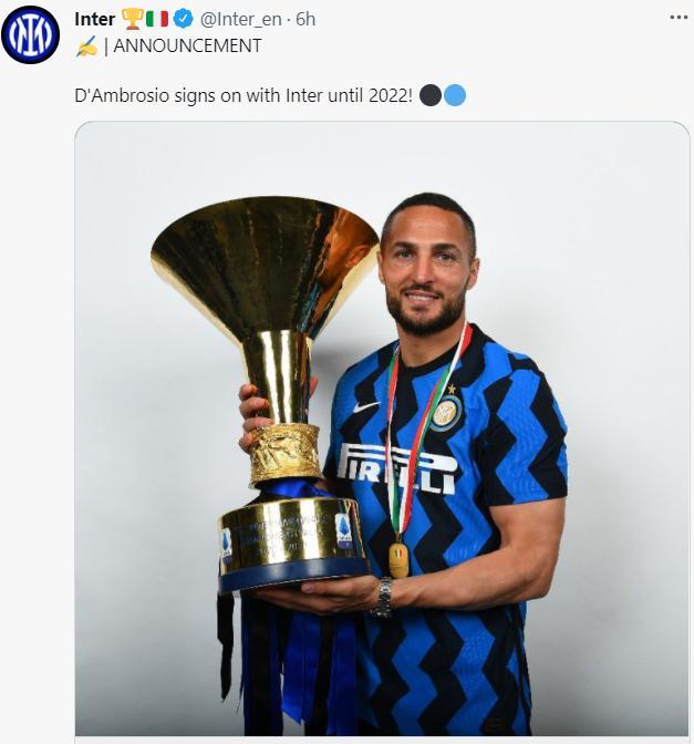 32岁的丹布罗西奥司职边后卫,他在2014年加盟国米,上赛季出场24次,打进3球。