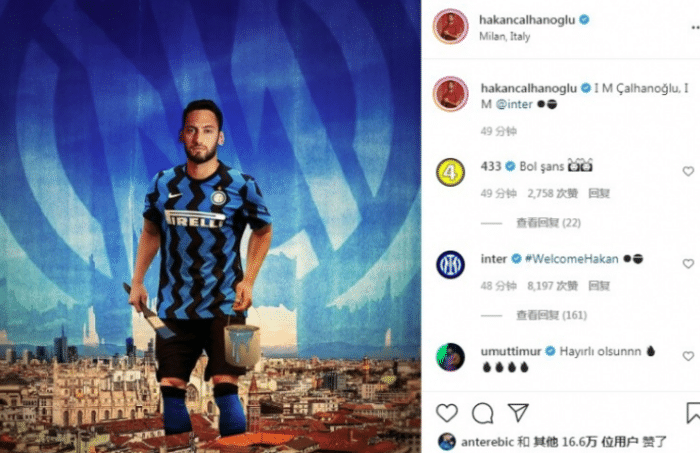 作为效力米兰长达4年的球员,恰尔汗奥卢共为米兰出战172场,贡献32球48助。20-21赛季,他代表AC米兰各赛事出战43场数据为9球12助攻。不过在合同到期之后,双方没有就续约谈拢。随后,恰尔汗奥卢转投国米,据悉国米开出的年薪是500万欧元。而在加盟之后,恰尔汗奥卢发布了一张加盟照。恰尔汗奥卢身穿新东家球衣,手拿油漆桶,正将米兰城粉刷上新的颜色。而且他还写道:“我是恰尔汗奥卢,我是国米人。”