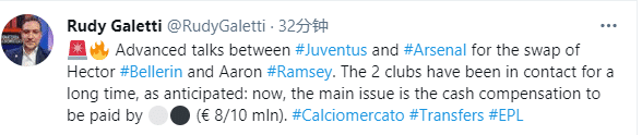 要补偿枪手800-1000万欧元的现金。当初拉姆塞从枪手自由加盟尤文,双方的合同还有两年。