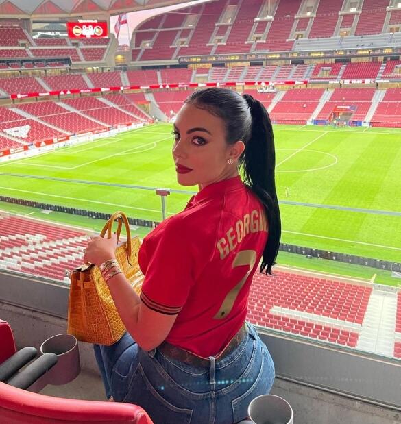 不得不说,乔治娜的这波狗粮撒的分量还是很足的,不过显然乔治娜的撒狗粮操作可不仅仅这一波,此后乔治娜又发布了自己穿上C罗球衣观赛加油的照片,继续为C罗加油。