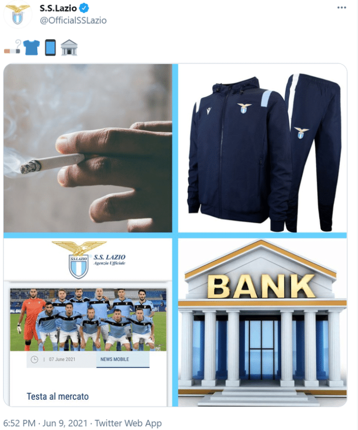 直播车讯这张图片中有一根燃烧的香烟,一套拉齐奥的运动服,一张球队合照和一个写有“银行”的卡通建筑。