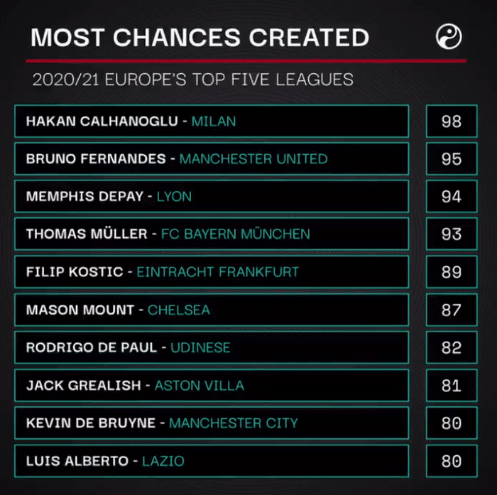直播车讯 Squawka统计了2020-21赛季五大联赛球员的创造机会次数排行榜,恰尔汗奥卢98次第一,布鲁诺-费尔南德斯95次第二,德佩94次第三。