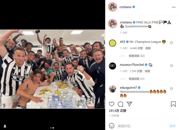 赛后,他霸气地晒出一张自己做噤声动作的照片,让质疑自己的人们闭上嘴巴。另外他还配上一张尤文球员们在更衣室里庆祝的照片,并为照片配上尤文的口号:“直到最后。”
