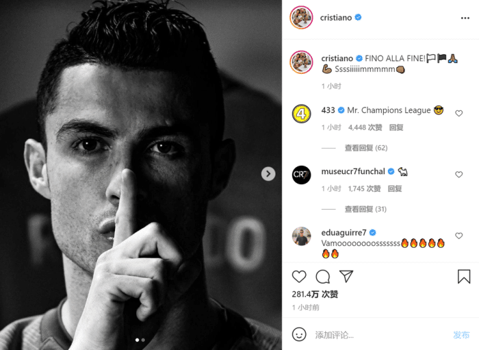 直播车讯 今天凌晨,尤文图斯在意甲收官战中4-1大胜博洛尼亚,锁定下赛季欧冠资格,赛后C罗在Instagram上发图庆祝,同时霸气回应质疑者。