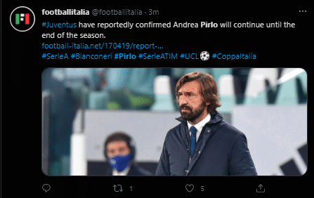 根据迪马济奥的报道,尽管尤文昨天遭受了一场惨痛的失利,但俱乐部无意在本赛季结束前更换主帅,皮尔洛会执教尤文直到本赛季结束。