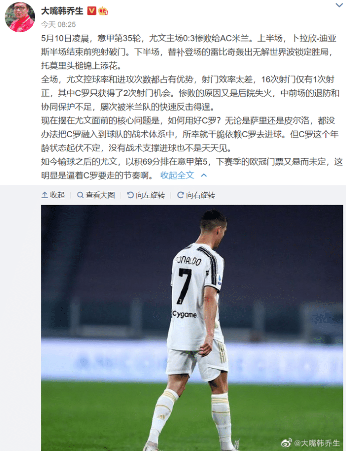 韩乔生在其微博中写道:“5月10日凌晨,意甲第35轮,尤文主场0:3惨败给AC米兰。上半场,卜拉欣-迪亚斯半场结束前兜射破门。下半场,替补登场的雷比奇轰出无解世界波锁定胜局,托莫里头槌锦上添花。”