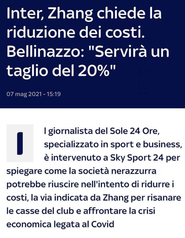不过来自《都灵体育报》掌握的最新消息,国米想让全部球员放弃一个月月薪并且放弃意甲夺冠奖金的提议,球员们并没有接受,他们没有妥协的想法。