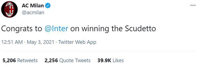 今天凌晨,国米的同城死敌AC米兰在官推上大度的表示祝贺,他们写道:“祝贺国际米兰赢得意甲联赛冠军。”