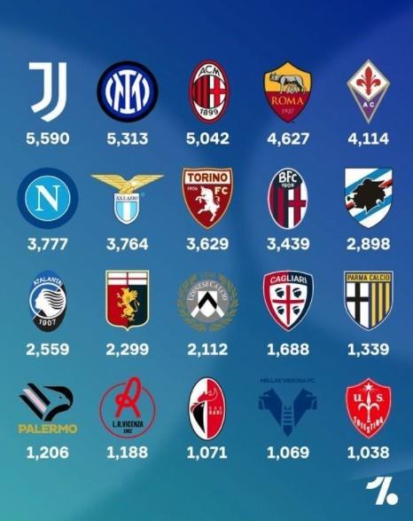 直播车5月2日讯 近日,意大利媒体onefootball盘点了意甲历史总积分榜,尤文、国米、米兰位列前三,罗马第四。