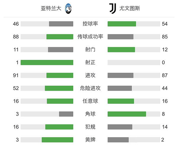 全场比赛结束,亚特兰大1-0尤文图斯。