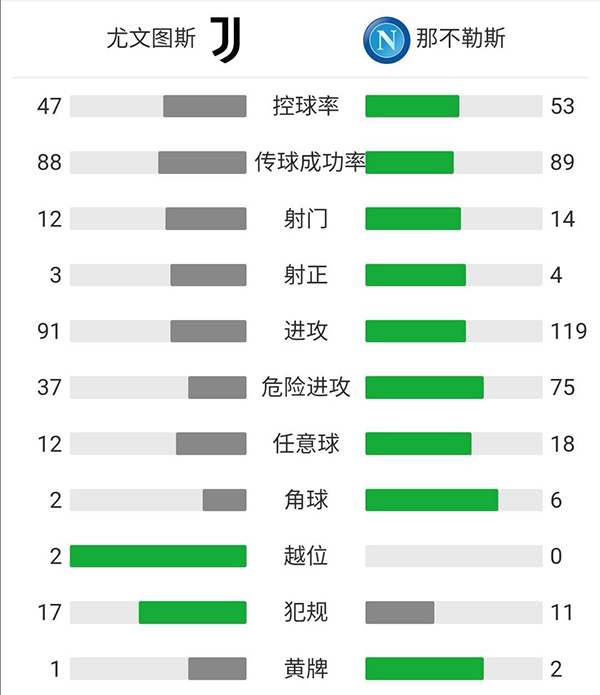 全场比赛结束,尤文图斯2-1那不勒斯。
