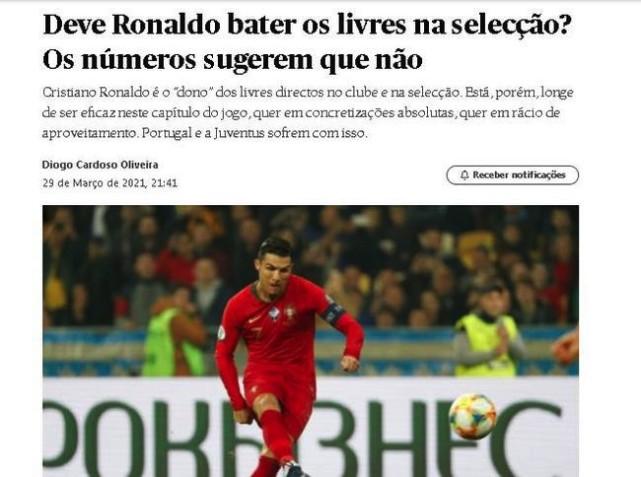 《公众报》以“C罗应该在国家队主罚任意球吗?数据建议不该”为标题写道:C罗是俱乐部和国家队直接任意球的“主人”,不过他的效率实在不能说高,无论是绝对数量还是得分效率都不够高,葡萄牙和尤文图斯为此战绩也受到了影响。