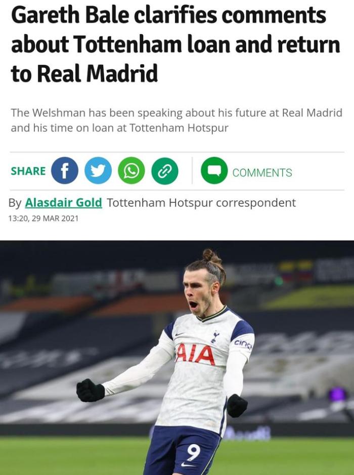 直播车3月31日讯日 贝尔在威尔士世预赛前的新闻发布会上,就最近关于他和热刺的租借关系及回归皇马的传闻做出了澄清。这名31岁的威尔士国脚由于最近重返皇马的言论而深陷舆论漩涡。