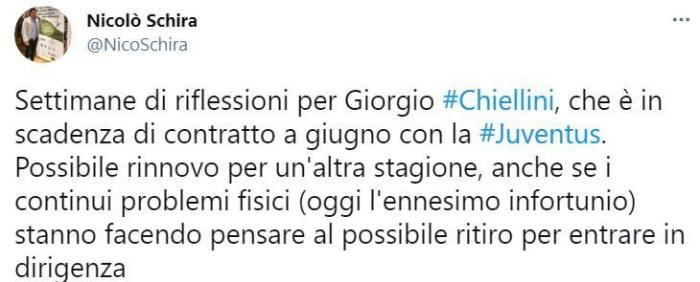 斯基拉表示,基耶利尼将在接下来的几个星期思考自己的未来,他与尤文的合同在今夏到期,可能会选择续约1年。即使持续不断的伤病可能让他选择退役,并加入尤文管理层。