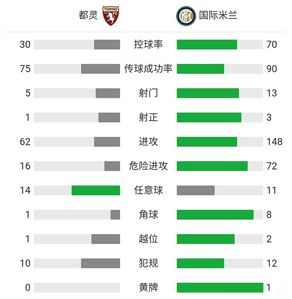 全场比赛结束,国际米兰客场2-1战胜都灵。