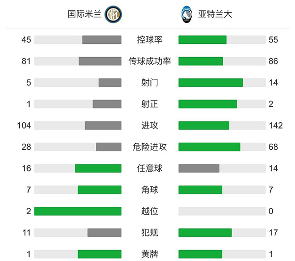 全场比赛结束,国际米兰1-0击败亚特兰大,继续稳居意甲榜首。