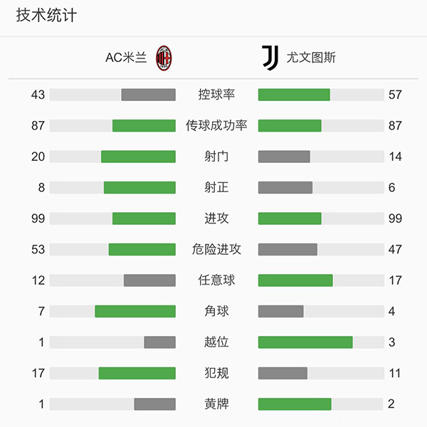 第61分钟,迪巴拉转移到右路,小基耶萨禁区前沿突施冷箭,皮球钻入网窝,AC米兰1-2尤文图斯!