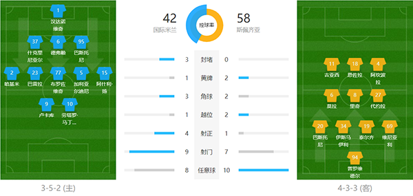 国际米兰出场阵容:1-汉达诺维奇,6-德弗里,37-什克里尼亚尔,95-巴斯托尼,2-阿什拉夫(79分钟,33-丹布罗西奥),15-阿什利-扬(79分钟,36-达米安),23-巴雷拉,77-布罗佐维奇(65分钟,22-比达尔),5-加利亚尔迪尼(45分钟,12-森西),10-劳塔罗-马丁内斯,9-卢卡库(79分钟,14-佩里西奇)