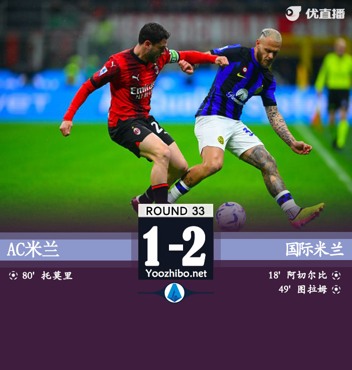 来源:直播车04-23 04:51 直播车讯:北京时间4月23日,意大利足球顶级联赛第33轮,AC米兰在主场迎战国际米兰。比赛中,AC米兰的托莫里取得进球,而国际米兰的阿切尔比和马库斯-图拉姆也分别建功。最终,国际米兰以2-1战胜AC米兰。
