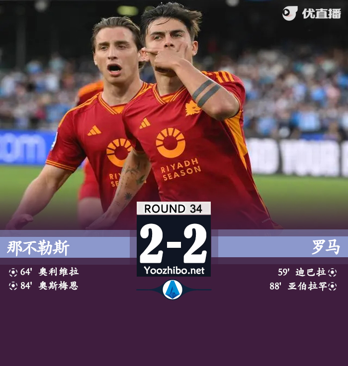 来源:直播车04-29 03:28 直播车讯:北京时间4月29日,意大利足球顶级联赛迎来第34轮的激烈对决,那不勒斯在主场迎战罗马。上半场,两队互交白卷。下半场,阿兹蒙造点,迪巴拉稳稳罚入。奥利韦拉射门击中克里斯滕森折射后入网,那不勒斯很快扳平比分。随后,桑切斯送点,奥斯梅恩主罚命中。比赛尾声阶段,罗马利用角球,由亚伯拉罕破门完成绝平。全场比赛结束,那不勒斯2-2战平罗马。