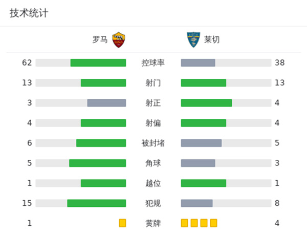 全场比赛结束,罗马2-1莱切。