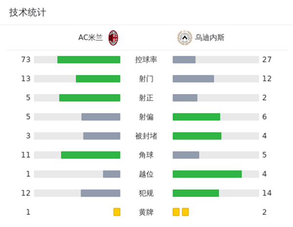 来源:直播车11-05 13:40 直播车讯 :北京时间11月05日意甲联赛第11轮,AC米兰主场对阵乌迪内斯。上半场,两队互交白卷。下半场,主裁判判罚米兰禁区内犯规,乌迪内斯获得点球,佩雷拉一蹴而就。比赛最后时刻,米兰对客队发起了围攻,但是最后还是未能破门。全场比赛结束,米兰主场0-1不敌乌迪内斯,送对手获得本赛季意甲首场胜利,而红黑军团则是各项赛事连续四场不胜。