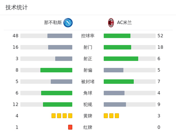 来源:直播车10-30 07:20 直播车讯 :北京时间10月30日意甲联赛第10轮,那不勒斯主场对阵AC米兰。上半场,卡卢卢因伤无法坚持,佩莱格里诺替补上演首秀。随后,吉鲁头球两度攻破那不勒斯球门。下半场风云突变,波利塔诺爆射扳回一城,拉斯帕多里通过任意球扳平比分。比赛尾声阶段,纳坦-德索萨犯规吃到第二张黄牌被罚下。全场比赛结束,米兰2-2战平那不勒斯,遭遇各项赛事三场不胜。