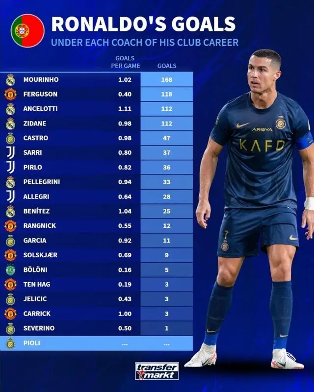 德转统计C罗历任主帅执教进球数,穆里尼奥168球居首,滕哈赫仅3球