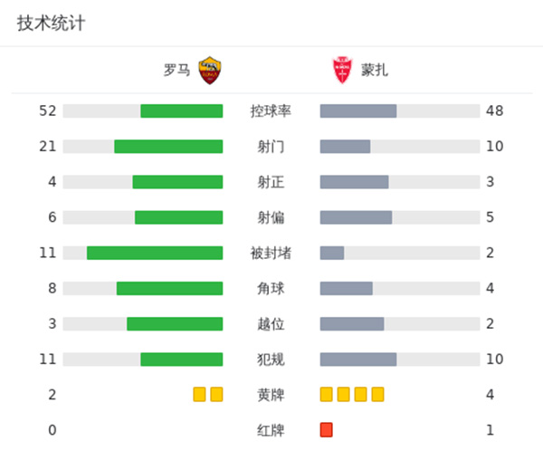 来源:直播车10-22 21:03 直播车讯 :北京时间10月22日18:30,意甲第9轮继续进行,罗马坐镇主场罗马奥林匹克球场迎战蒙扎,本场主裁判为艾罗尔迪。上半场,丹布罗西奥累计两黄被罚下,奥亚尔与贝洛蒂的威胁攻门均被迪格雷戈里奥化解。下半场,卢卡库与阿兹蒙先后中框,沙拉维替补献绝杀,穆里尼奥最后时刻被直红罚下。最终,罗马主场1-0小胜十人蒙扎。