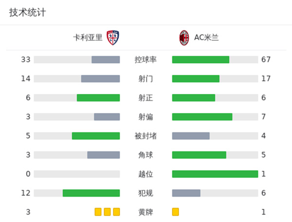 第29分钟,阿德里后场护球被断,卢文博小角度抽射破门,卡利亚里1-0AC米兰。