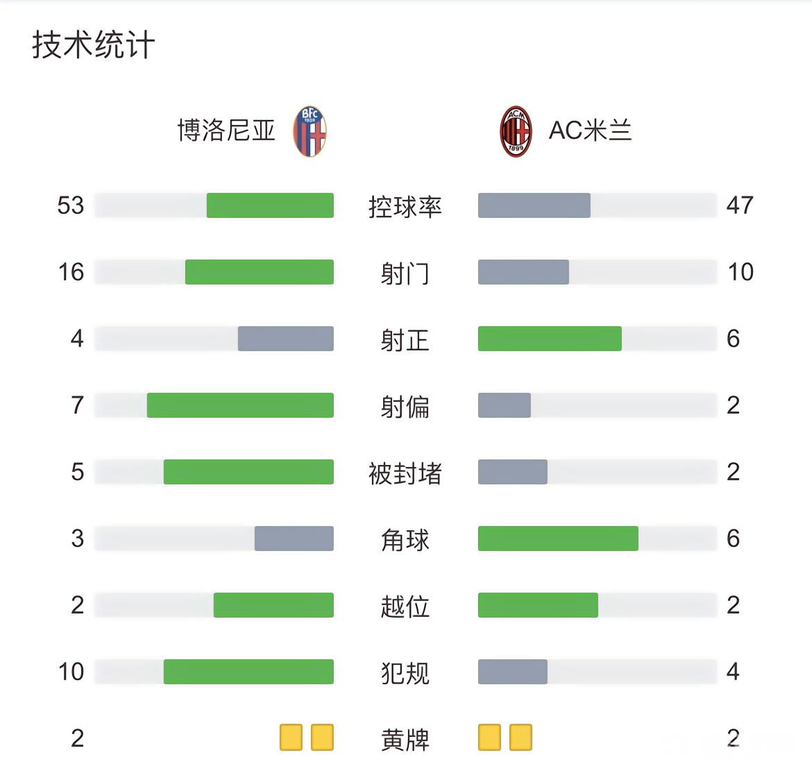 全场比赛结束,最终AC米兰2-0博洛尼亚。