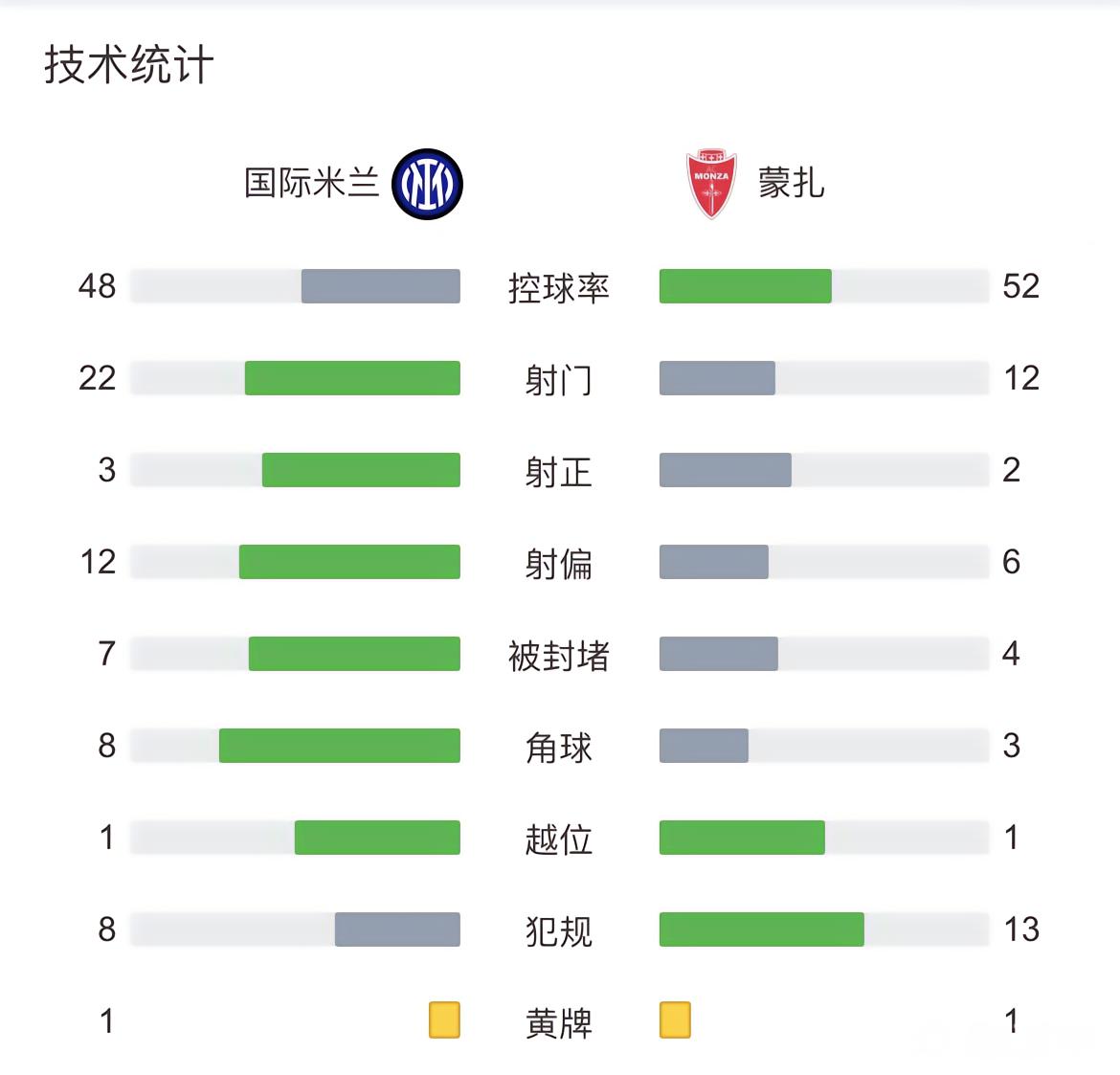 第7分钟,巴雷拉挑传,邓弗里斯再低平球传中,劳塔罗包抄推射得手,国际米兰1-0蒙扎!