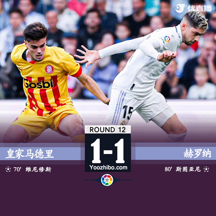 直播车讯北京时间10月30日23点15分,西甲第12轮皇家马德里主场对阵赫罗纳。上半场,罗德里戈射中立柱,埃雷拉爆射回敬一脚门框。下半场,维尼修斯破门,阿森西奥送点,斯图尼亚点射扳平,罗德里戈进球被吹,克罗斯两黄变一红被罚下。全场比赛结束,皇家马德里1-1赫罗纳。