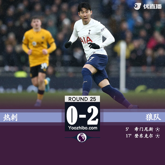 直播车2月13日讯 北京时间2月13日22点,英超第25轮热刺对阵狼队。上半场,洛里多次贡献扑救但仍旧被希门尼斯和登东克尔通过补射各进一球,孙兴慜错失良机。下半场,热刺后防仍旧频频犯错,狼队连续错失良机,温克斯抽射中柱,全场比赛结束,热刺0-2狼队。