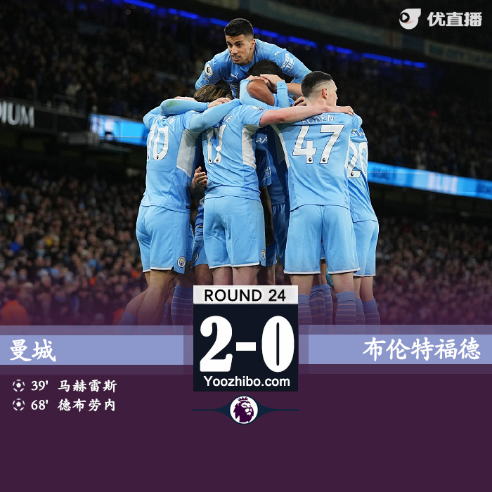 直播车2月10日讯 北京时间2月10日03:45,英超第24轮继续进行,曼城主场迎战布伦特福德。上半场,斯特林制造点球,马赫雷斯主罚命中。下半场,德布劳内利用大卫-拉亚的失误再入一球。最终,曼城2-0战胜布伦特福德14轮不败,12分优势继续领跑积分榜。