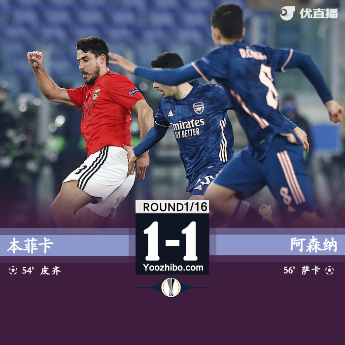 直播车2月19日讯 北京时间2月19日4:00,欧联杯1/16决赛首回合一场比赛在本菲卡和阿森纳之间进行。上半场奥巴梅扬失良机,扎卡传球失误险些造成丢球。下半场史密斯-罗送点皮齐主罚命中,萨卡扳平比分,奥巴梅扬再次错失机会。最终阿森纳客场1-1战平本菲卡,双方次回合较量将在2月26日进行。