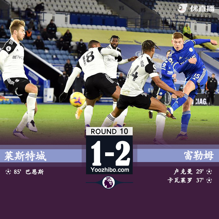 直播车讯:北京时间12月1日1:30,英超第10轮,莱斯特城迎战富勒姆。上半时安古伊萨助卢克曼为富勒姆首开纪录,博比-里德造点,卡瓦莱罗罚进扩大优势。下半时瓦尔迪助伯恩斯追回1球。全场战罢,最终,莱斯特城1-2富勒姆。本场战罢,莱斯特城18分,富勒姆7分。