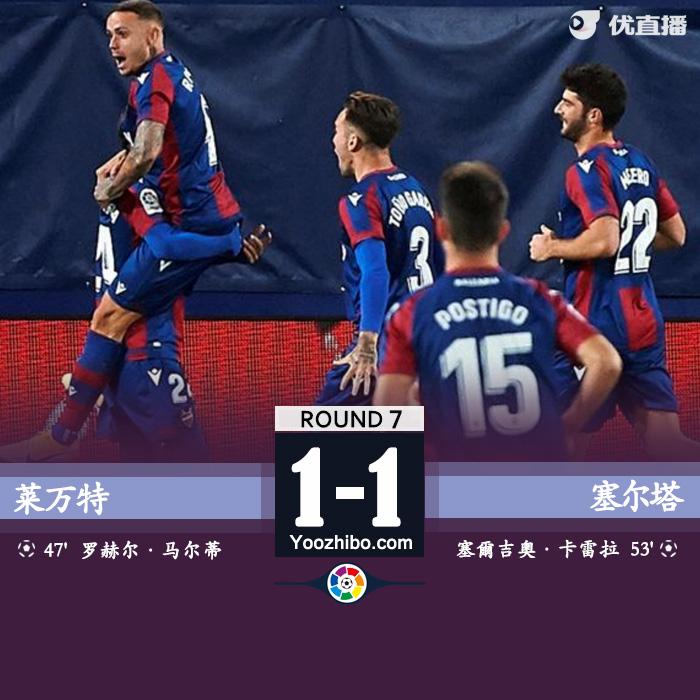 直播车讯:北京时间10月27日凌晨,2020-2021赛季欧洲五大联赛结束最新一轮比赛争夺。其中,莱万特主场迎战塞尔塔,马尔蒂破门卡雷拉处子球,莱万特1-1塞尔塔。
