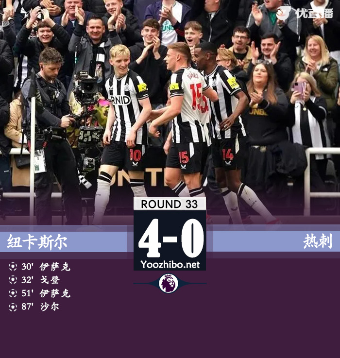 直播车讯:北京时间4月13日在英超联赛第33轮的比赛中,纽卡斯尔联队在主场迎战托特纳姆热刺队。伊萨克在比赛中攻入两球,安东尼-戈登和法比安-舍尔也各自有进球。最终比分是纽卡斯尔联 4-0 托特纳姆热刺。